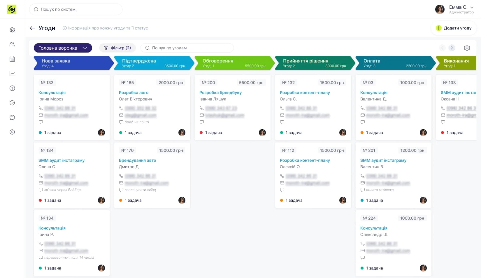 - Створення рахунків та актів, відстеження оплат по кожній угоді.