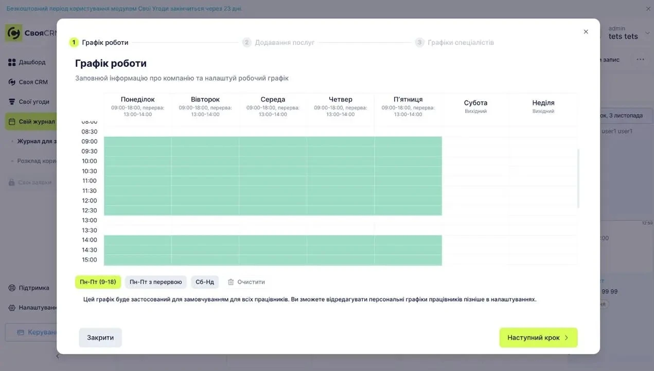 - Індивідуальні графіки працівників – легко задавати робочі дні, вихідні, перерви.